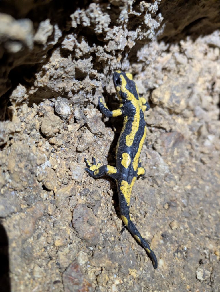 Quand tout le monde est arrivé en bas, on commence par se diriger vers le lac. On y voit deux petits rhinolophes et une salamandre tachetée.